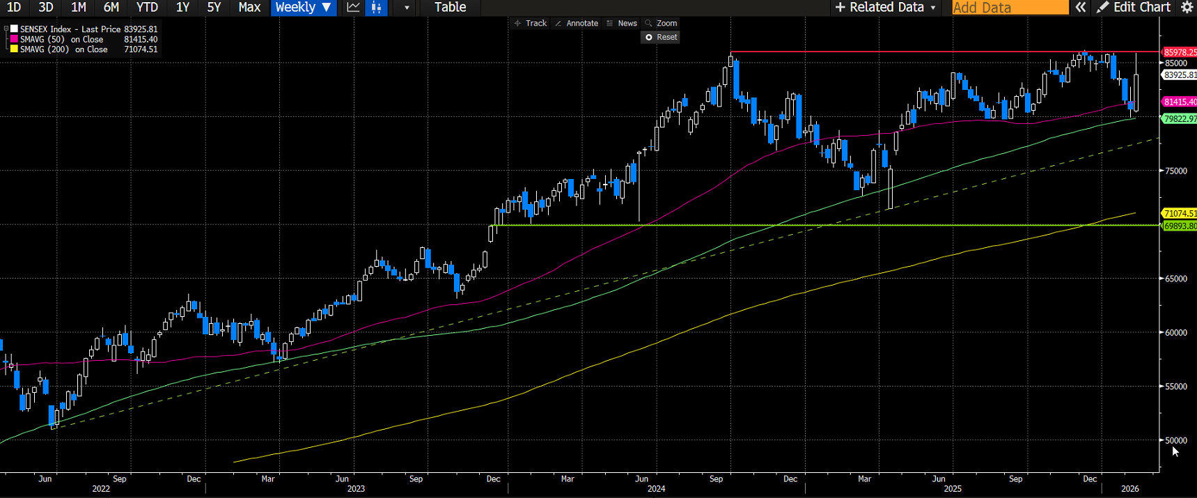L'indice ha rimbalzato dalla sua media mobile a 50 periodi (su time frame settimanale) riportandosi in breve nei pressi dell'importante area di resistenza a quota 85978 punti. Un livello di resistenza che aveva già respinto al ribasso i prezzi a novembre 2025 ma anche a inizio 2026.