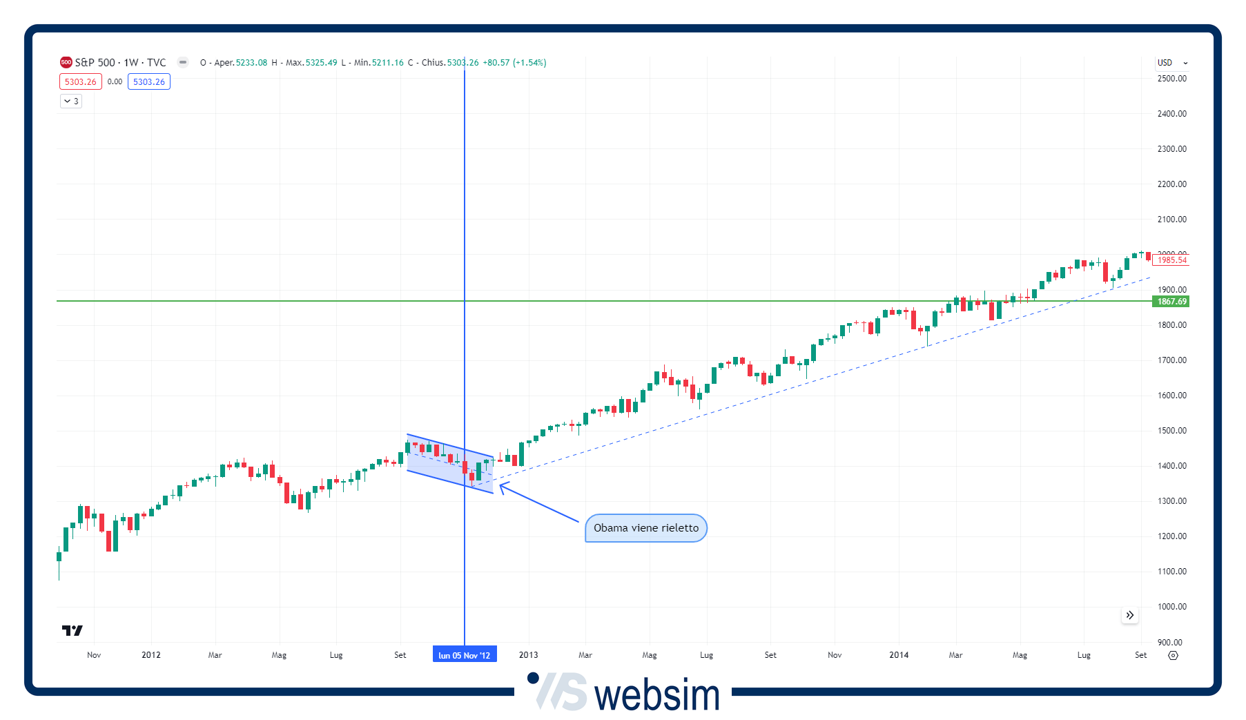 Stesso discorso anche per il 2012, anno che vide come protagonista Obama che venne rieletto per il suo secondo mandato. Come vediamo, anche in questo caso, prima dell’elezioni abbiamo assistito ad un incremento della volatilità, con i prezzi che hanno risentito dell’avvicinarsi dell’appuntamento di novembre. Al contrario, dopo il voto la tendenza è ripartita al rialzo.