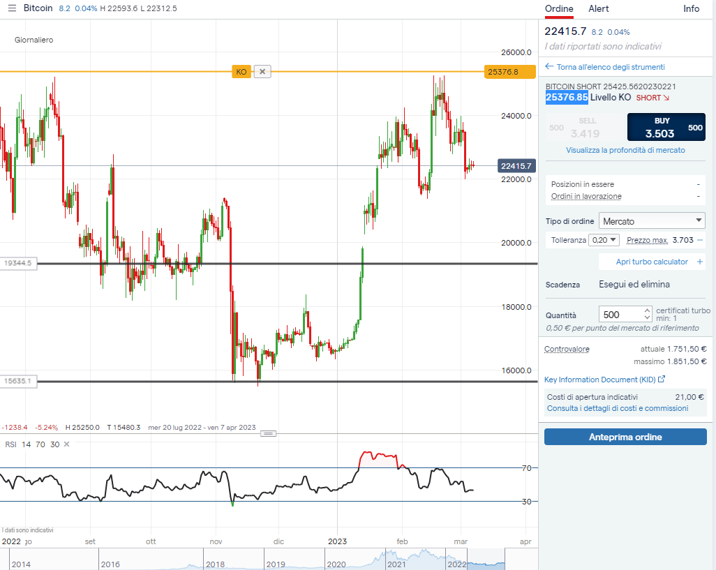 Operatività multiday: a questi prezzi, e soprattutto su eventuali spunti verso le resistenze in zona 24.000/25.000 usd, suggeriamo posizioni scalettate SHORT sul BITCOIN con Knock Out a 25.376,85 usd, fattore di leva 7x, con il certificato disponibile sulla piattaforma IG.