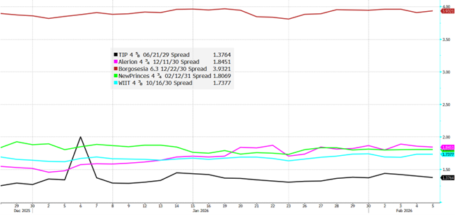 Serie storica da dicembre 2025 degli spread tra i bond citati e un Bund 2030.
