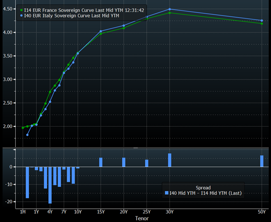 Curva dei tassi dei BTP (in blu) e degli OAT (in verde) e in basso lo spread per ogni scadenza di lunedì 6 ottobre.