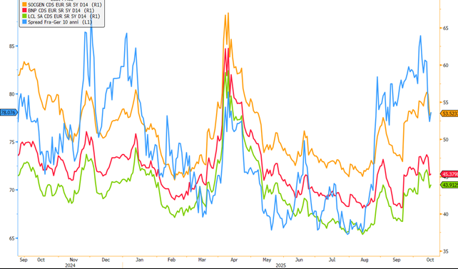 La reazione in seguito all’annuncio delle dimissioni di Lecornu è stata di un incremento del decennale di 10pb e un allargamento dello spread OAT-Bund anch’esso di 10pb. Qualcuno già chiama la Francia il “nuovo malato d’Europa”: piuttosto significativo lo spread tra gli OAT e i BTP che il giorno della dichiarazione sono stati negativi fino alla scadenza a 10 anni. In seguito alla presentazione della nuova squadra di governo, i tassi decennali dei due Paesi si equivalgono in area 3,45%. La pressione non si vede solo sui Titoli di Stato, ma anche sui CDS delle banche francesi: in netto aumento: il costo per assicurarsi contro il rischio di default sta aumentando.