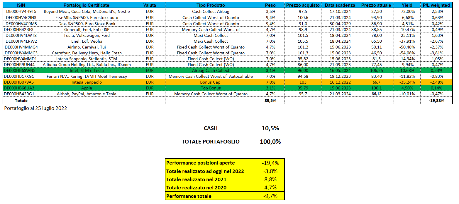 Anche a luglio siamo stati volutamente con un atteggiamento wait and see. Ci aspettiamo ancora un po’ di volatilità, perciò, puntiamo ad intercettare, con la liquidità attuale (10,5%), qualche opportunità a settembre. Durante il webinar abbiamo già mostrato diverse possibilità interessanti per diversi profili d’investimento come, per esempio, i due Step-Down Cash Collect: ISIN DE000HB8KNM9 su Generali per i profili più conservativi e ISIN DE000HB8KNU2 su Nvidia per i più speculativi.
