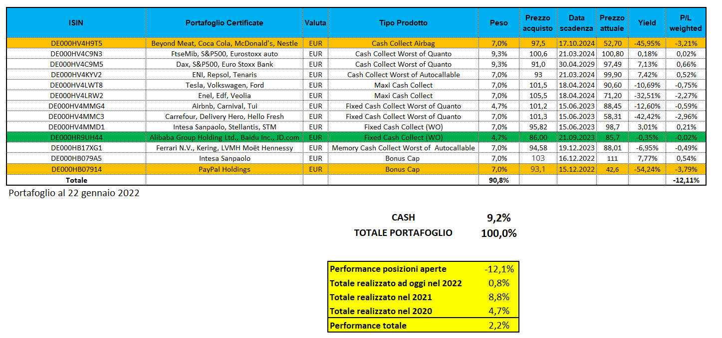 *Comunicazione di marketing Incertezza si somma ad incertezza: il 2022 è iniziato veramente male. Putin alla fine lo ha fatto veramente e ha attaccato l’Ucraina militarmente. Intorno alle 4:00 è iniziata quella che secondo gli ucraini è un’invasione su larga scala, mentre i russi affermano essere un’operazione speciale destinata a smilitarizzare e de nazificare il paese confinante. Fatto sta che siamo andati ben oltre quello che poteva essere solo l’occupazione del Donbass, siamo di fronte ad una dichiarazione di guerra. Anche se le operazioni dovessero fermarsi dopo la distruzione delle basi militari ucraine, ora un accordo nel breve è più difficile. Le vicende delle ultime ore potrebbero anche accelerare i tempi di entrata in uno scenario di forte rallentamento economico, (e secondo alcuni anche di potenziale stagflazione) che era stato indicato come più evidente nel corso del secondo trimestre/semestre, aumentando la permanenza di livelli elevati di inflazione. Il dilemma di politica monetaria per le banche centrali potrebbe essere dunque più vicino: focalizzarsi più sulla crescita o sull’inflazione? Questa settimana la Bundesbank ha preannunciato che nel primo trimestre la Germania metterà a segno un secondo calo del Pil dopo il -0,7% t/t del quarto trimestre, entrando pertanto in recessione tecnica. La Bundesbank nel bollettino aveva anche prefigurato una rapida ripresa nel secondo trimestre che però le vicende di questi giorni mettono a rischio a causa principalmente dell’impatto sui costi delle materie prime. La domanda a questo punto è: come reagiranno le banche centrali di fronte ad un’inflazione più persistente ed elevata, alla luce anche delle vicende dell’Ucraina. L’osservato speciale è la Fed che potrebbe optare per l’avvio di rialzi dei tassi al ritmo di 25 pb, accelerando i tempi di manovra del bilancio per frenare la componente inflattiva maggiormente collegata ad i consumi (credito al consumo, mutui casa ecc). Oggi avremo a disposizione diverse dichiarazioni di membri Fed e BCE. In questo contesto la curva dei tassi potrebbe continuare ad appiattirsi, con accelerazione di una rotazione all’interno dei settori value fino a marzo /aprile, prima di ipotizzare un cambio verso i growth. Come intendiamo agire in questo contesto di mercato? Abbiamo comprato invece il certificato Fixed Cash Collect ISIN DE000HR9UH44 su basket composto da Alibaba Group Holding, Baidu e JD.com per diversificare il più possibile per area geografica e settore, e tenendo in considerazione le diverse politiche monetarie della banca centrale cinese attualmente più accomodante di quelle Occidentali. Inoltre, il certificato paga premi incondizionati dello 0,8% mensili, garantendoci rendimento in questa fase di difficoltà dei mercati con un buon grado di resilienza durante la vita del prodotto. La struttura Fixed Cash Collect senza autocall, infatti, ha un delta di struttura basso e si muove molto meno dei normali cash collect o dei sottostanti azionari. Ne abbiamo ben 4 in portafoglio. Nel mese di febbraio hanno pagato le cedole 6 prodotti per un totale di 6,2 euro a certificato. La liquidità ammonta al 6,4%.