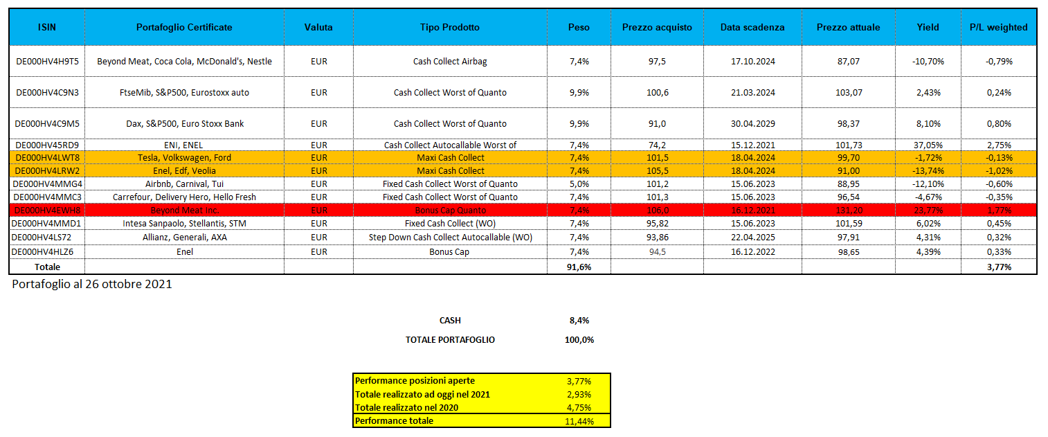 • Abbiamo chiuso il certificato Bonus Cap su Beyond Meat ISIN DE000HV4EWH8 che pesava il 7,4% sul portafoglio. Il prodotto è stato chiuso perché, come noto, il titolo ha avuto un fortissimo calo a Wall Street il giorno 22 ottobre 2021. Essendo il livello barriera abbastanza vicino a 81,864 usd e la scadenza prossima (dicembre 2021), abbiamo preferito chiudere il certificato in netto guadagno. Questo anche perché il titolo è presente nel Cash Collect Airbag ISIN DE000HV4H9T5. Troppo rischioso dunque detenere in due certificati il titolo.