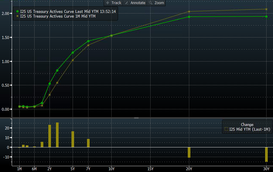 Tale meccanismo spiega anche l’indifferenza “apparente” del mercato azionario a dati macro certo non positivi come per esempio quello americano. Il mercato sconta il fatto che più si rafforza l’inflazione e più le banche centrali riducono gli stimoli o cambiano le politiche monetarie in più restrittive e maggiore sarà l’impatto sulla crescita globale nel medio lungo termine. Questo lo si vede benissimo dalla curva dei tassi obbligazionari, li dove la parte a breve della curva (fino ai 3 anni) effettivamente si è alzata per tenere conto dell’inflazione, mentre la parte a lungo si è abbassata rispetto a un mese fa, generando un flattening della curva. Il messaggio è chiaro, il mercato vede un netto indebolimento della crescita legata alla combo inflazione crescente e banche centrali meno accodanti.