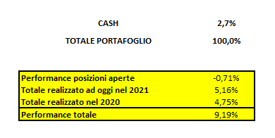*Comunicazione di marketing La conferma di Powell alla presidenza della Fed per un secondo mandato, unita alle indiscrezioni secondo cui la Banca Centrale americana potrebbe velocizzare il tapering per chiuderlo già a marzo e poi cominciare con il rialzo dei tassi non ha smosso più di tanto gli animi. Abbiamo assistito ad un paio di sedute di volatilità sul mercato azionario e a rendimenti dei Titoli di Stato lievemente al rialzo. Siamo ancora lontani però dai massimi di marzo/aprile 2021. Probabilmente, per spiegare questa dinamica, la lettura che il mercato sta facendo è che la combinazione di inflazione crescente e persistente (se pur temporanea) unita a politiche meno accomodanti della Fed, avranno il prossimo anno impatto sulla crescita economica bloccando poi eventuali aumenti di tassi da parte della banca centrale. Insomma, il mercato non sembra credere che la formula di Powell sia quella corretta per “curare” l’inflazione, inoltre ritiene che alla lunga ci sarà un impatto boomerang sulla crescita. Il portafoglio procede bene con una performance 2021 in crescita. Siamo passati dal 3% circa di ottobre, al 5,16% che vedete nella tabella (mostrata durante il webinar di questo mese), anche se, con la chiusura di un prodotto e l’autocall di un altro, in realtà saliamo a novembre al 8,5%. Cosa abbiamo fatto a novembre sul nostro portafoglio? • È andato in autocall il certificato ISIN DE000HV4LS72 Step Down Cash Collect Autocallable (WO) su Allianz, Generali, AXA. Il certificato è stato comprato a 93,86 euro e chiuso a 100 + 0,5% di cedola, per un guadagno del 7,1% circa e dello 0,52% sul portafoglio. • Abbiamo chiuso, prima della scadenza naturale (15 dicembre 2021), il certificato Cash Collect Autocallable Worst of ISIN DE000HV45RD9 su Enel e Eni. Il certificato era in carico a 74,2 euro. Lo abbiamo chiuso a 103,3 euro, portando a casa quasi un 40% di performance, pari al 2,8% sul portafoglio. • La liquidità generata con la vendita del certificato su Enel ed Eni l’abbiamo investita sul certificato DE000HV4KYV2 su ENI, Repsol, Tenaris. Il prodotto è stato comprato a 94,05 euro. La strategia qui è quella di valorizzare velocemente il prodotto già alla prima data di autocall che è il 16 dicembre 2021. Se tutti i sottostanti saranno sopra lo strike, e l’unico sotto è Repsol (-1,8% dallo strike), il certificato pagherà 100 euro più il premio del 1%. Porteremmo così a casa il 6,4%. Il peso sul portafoglio del nuovo prodotto sarà del 7,3% circa. • Rimane dunque una liquidità di circa il 10% che lasciamo in cash per cogliere eventuali opportunità dal mercato.