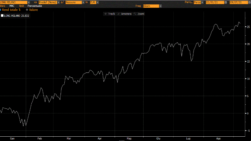 Il nostro listino principale, l'indice FTSEMIB, ha segnato a metà agosto il nuovo massimo dell'anno corrispondente anche al massimo degli ultimi 13 anni, avviando quella che crediamo possa essere una inversione del trend ribassista di lungo periodo. Manteniamo perciò un cauto ottimismo sulla borsa italiana. convinti che ci sia ulteriore margine di recupero soprattutto sui titoli finanziari ancora fortemente sottovalutati.