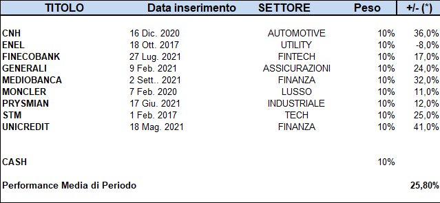 Specifichiamo che la Performance indicata dei singoli titoli è quella del periodo 1 Gennaio 2021 - 01 Settembre 2021 (non annualizzata). Ciò consente un confronto omogeneo con l'andamento degli indici benchmark. Si badi che NON si tratta della performance dei titoli dalla data del nostro inserimento perché del tutto fuorviante ai fini della corretta operatività. In rosso gli eventuali nuovi inserimenti.