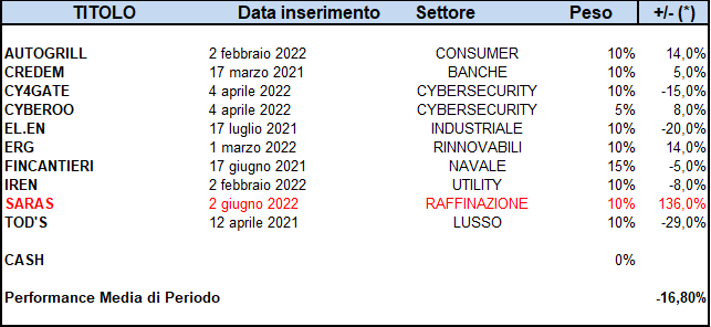 (*) Specifichiamo che la Performance dei singoli titoli è quella del periodo 1 Gennaio 2022 - 2 Giugno 2022 (non annualizzata). Ciò consente un confronto omogeneo. NON si tratta della performance dalla data del nostro inserimento perché del tutto fuorviante ai fini della corretta operatività. In rosso gli eventuali nuovi inserimenti.