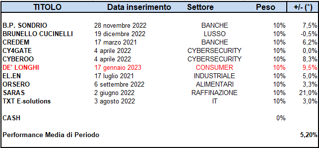 (*) Specifichiamo che la Performance dei singoli titoli è quella del periodo indicato non annualizzata. Ciò consente un confronto omogeneo. NON si tratta della performance dalla data del nostro inserimento perché del tutto fuorviante ai fini della corretta operatività. In rosso gli eventuali nuovi inserimenti.