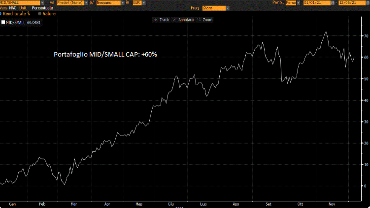 Annotiamo con piacere che il nostro Portafoglio concentrato sulle società a minore capitalizzazione continua a conservare una forte sovraperformance rispetto alla media degli indici di riferimento quando mancano ormai solo tre settimane alla fine del 2021.