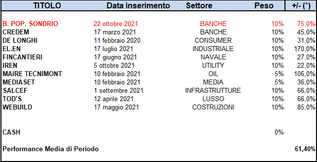 (*) Specifichiamo che la Performance dei singoli titoli è quella del periodo 1 Gennaio 2021 - 22 Ottobre 2021 (non annualizzata). Ciò consente un confronto omogeneo. NON si tratta della performance dalla data del nostro inserimento perché del tutto fuorviante ai fini della corretta operatività. In rosso gli eventuali nuovi inserimenti.