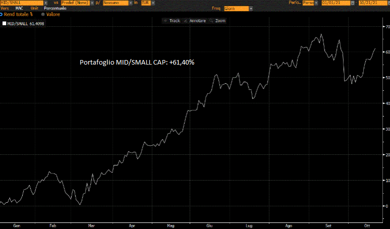 Il grafico seguente presenta la performance del Portafoglio nel periodo 1 Gennaio 2021 - 22 Ottobre 2021: +61,40%