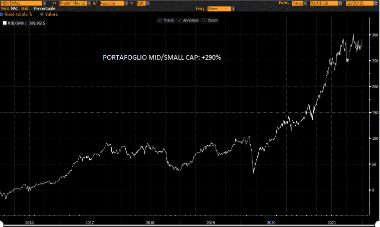 Il grafico seguente presenta la performance del Portafoglio nel periodo 1 Gennaio 2016 - 31 Dicembre 2021: +290,0%