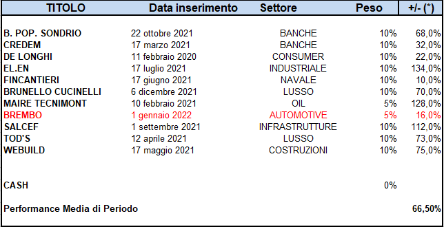 (*) Specifichiamo che la Performance dei singoli titoli è quella del periodo 1 Gennaio 2021 - 31 Dicembre 2021 (non annualizzata). Ciò consente un confronto omogeneo. NON si tratta della performance dalla data del nostro inserimento perché del tutto fuorviante ai fini della corretta operatività. In rosso gli eventuali nuovi inserimenti.