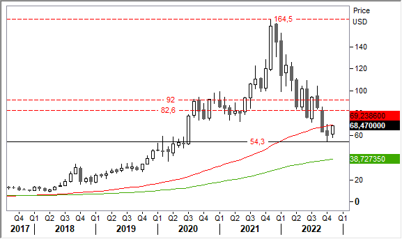 Analisi Tecnica. La tendenza di lungo periodo è rimasta saldamente rialzista fino al picco record di fine 2021 in area 164,50 usd. Da quel livello è partita una prolungata fase correttiva che non può dirsi ancora conclusa. Anzi, il cedimento della media mobile evidenziata in rosso ha peggiorato ulteriormente il quadro.