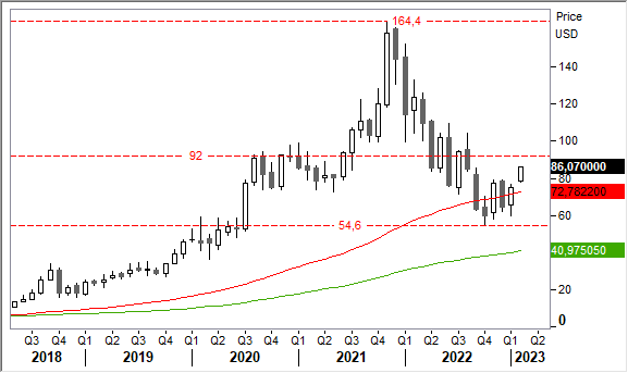 Operatività. Scattati gli acquisti in tendenza alla prima chiusura sopra 70 usd e gli incrementi di posizione al superamento di area 80 usd. Target di breve verso 92 usd. Target finale 100 usd. Stop loss sotto 65 usd.