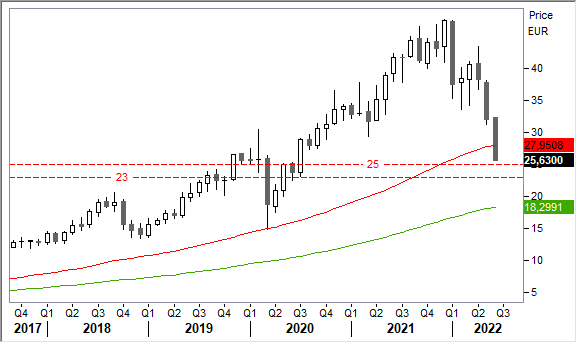 La violenta correzione del primo semestre di quest'anno ha spinto i prezzi sulla media mobile di lunghissimo periodo (in rosso), che potrebbe frenare la discesa. Il cedimento di questo livello renderebbe altamente probabile una ulteriore discesa fino ad area 18 euro.