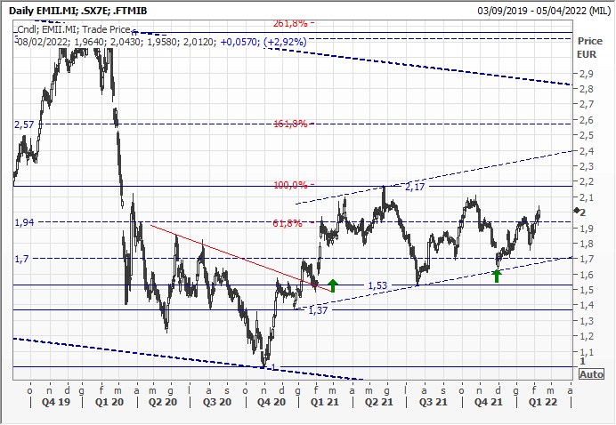 Graficamente, dai top del 2007 a 12,75 euro (prezzo rettificato) il prezzo si è quasi "azzerato", visti i minimi assoluti toccati a 1 euro a ottobre 2020, in occasione dell'aumento di capitale. Da lì è iniziata una fase di recupero, stentata ma tuttora in corso. Il modello rialzista completato a inizio anno sopra 1,5 euro ha favorito il raggiungimento del target "normale" (100% della proiezioni di Fibonacci) sui massimi dell'anno segnati a maggio 2021 a 2,17 euro. Il successivo consolidamento ha confermato la validità della zona supportiva 1,70/1,50 euro: ci aspettiamo il ritorno sui massimi con discrete chance di allungare verso 2,60 euro (proiezione 161,8% di Fibonacci).