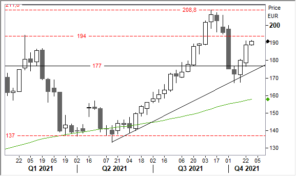 Operatività multiday. Abbiamo chiuso la strategia short in area 170 euro e ribaltato la posizione al rialzo per sfruttare uno scenario di assestamento. Ora sfruttiamo gli strappi in direzione del range 190/195 euro per prendere profitto. Maggiori dettagli operativi nella scheda tecnica.