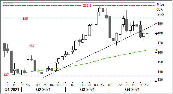 Operatività multiday. Sfruttare sistematicamente gli allunghi verso area 194/195 euro per prendere profitto. Scattati gli acquisti sulla debolezza in area 175 euro, scalettare gli ingressi fino a 167 euro. Stop loss sotto 160 euro. Maggiori dettagli operativi nella scheda tecnica.