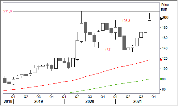 Il nove settembre scorso il titolo ha segnato i massimi degli ultimi 15 mesi a 208,80 euro.