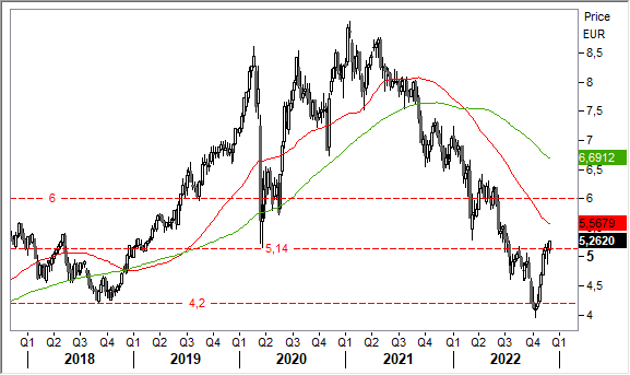 Graficamente, dal picco record di gennaio 2021 a 9,00 euro è partito un prolungato e pesante ritracciamento, che sta comnciando a fornire i primi segnali di esaurimento. La fascia di supporto raggiunta in area 4,20/4,0 euro è di grande valenza grafica e ha fatto scattare l'esteso rimbalzo tuttora in corso.