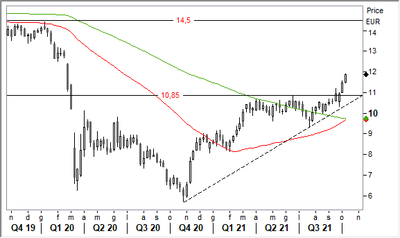 Analisi Tecnica. La tendenza rialzista sta accelerando grazie alla rottura convincente di un'area discriminante di forte valenza, ovvero della parte alta del range 9,60/10,80 euro che ha veicolato il movimento negli ultimi mesi.