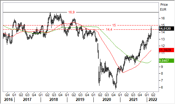 Analisi Tecnica. La tendenza rialzista ha accelerato grazie alla rottura convincente di un'area discriminante di forte valenza e della chiusura del gap down in area 12,50 euro del febbraio 2020. L'accelerazione delle ultime sedute ha portato la quotazione a ridosso della prima area target posizionata nel range 14,40/15,0 euro.