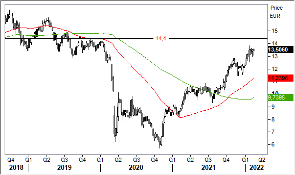 Analisi Tecnica. La tendenza rialzista sta accelerando grazie alla rottura convincente di un'area discriminante di forte valenza e della chiusura del gap down in area 12,50 euro del febbraio 2020. I livelli pre-pandemia, come si nota nel grafico allegato, sono ancora lontani. Primo scoglio intorno a 14,40 euro.