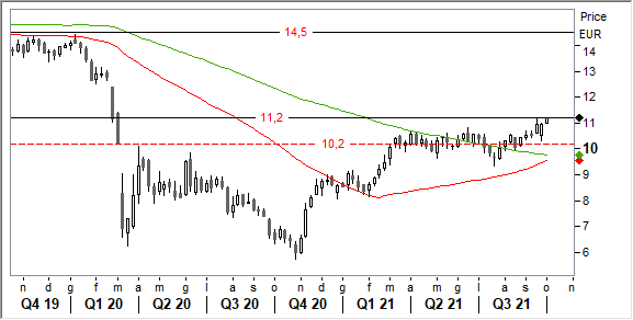 Analisi Tecnica. La tendenza rialzista sta accelerando grazie alla rottura convincente di un'area discriminante di forte valenza, ovvero della parte alta del range 9,60/10,80 euro che ha veicolato il movimento negli ultimi mesi.
