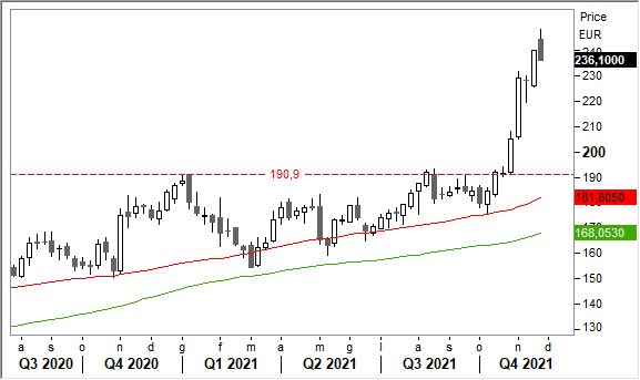 Lunedì il titolo aveva toccato il suo personale record storico con un prezzo di 248 euro.