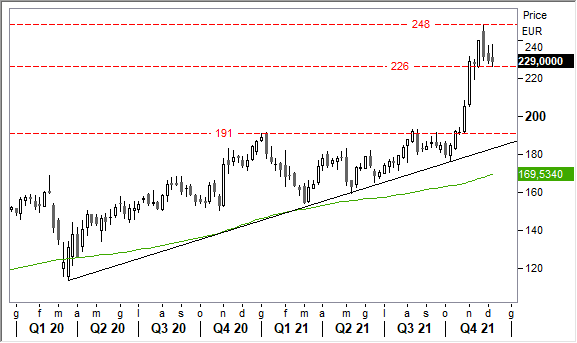 Graficamente, la tendenza di fondo è strutturalmente rialzista, ma dal picco record è partita una fisiologica fase correttiva utile per scaricare gli eccessi di breve, che potrebbe accelerare in caso di cedimento della prima soglia discriminante in area 226 euro.
