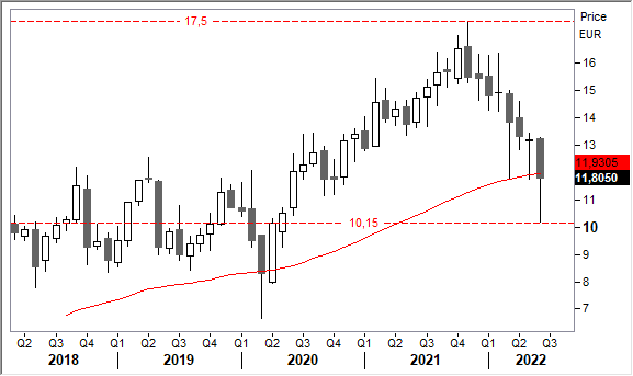 Graficamente, il quadro di fondo è ancora rialzista, mentre il quadro di breve è stato alterato bruscamente dallo scoppio della guerra in Ucraina e dal rialzo dei tassi. La reazione in corso è partita da un'area di forte sostegno, dove transita la media mobile di lungo periodo evidenziata in rosso. Prime resistenze verso area 13,0/13,50 euro.