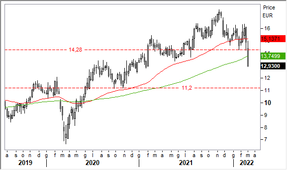 Graficamente, il quadro di breve viene alterato bruscamente dal cedimento del sostegno di breve in area 14,28 euro, minimo di gennaio, e della media mobile evidenziata in rosso. In mancanza di un pronto recupero, il sostegno successivo è in area 11,20 euro.