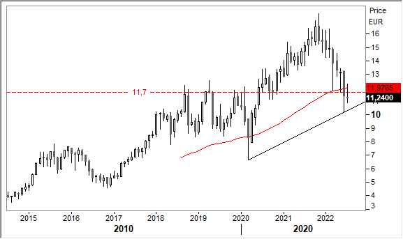 Graficamente, il quadro di fondo è ancora rialzista, mentre il quadro di breve è stato alterato bruscamente dallo scoppio della guerra in Ucraina e dal rialzo dei tassi. La reazione in corso è partita da un'area di forte sostegno, dove transita la media mobile di lungo periodo evidenziata in rosso. Segnali di spinta arriveranno con la risalita oltre 12,0 euro. Prime forti resistenze verso area 13,0/13,50 euro.