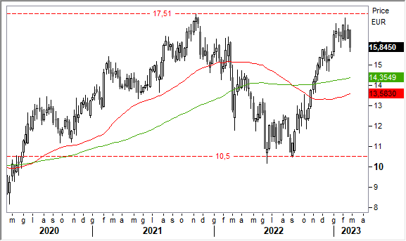 Graficamente, il trend è strutturalmente rialzista. La brillante reazione partita dai minimi di agosto 2022 in area 10,50 euro (in corrispondenza dei precedenti livelli di giugno) ha assunto maggiore consistenza con la violazione delle prime forti resistenze verso area 13,0/14,0 euro. Obbiettivo tecnico raggiunto sui top assoluti in area 17,50 euro.