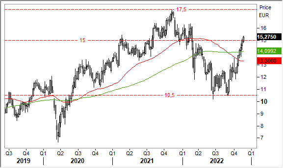 Stamattina UBS ha rafforzato la view positiva, alzando il target price da 14,60 a 16,80 euro.