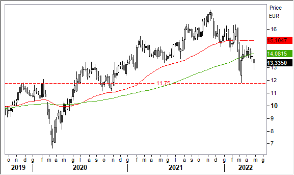 Graficamente, il quadro di breve è stato alterato bruscamente dal contemporaneo cedimento del sostegno di breve in area 14,28 euro, minimo di gennaio, e delle medie mobili evidenziate in rosso/verde.
