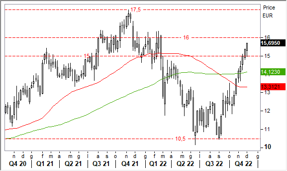 Operatività. Confermiamo la view positiva di lungo periodo. Lo strappo verso 14,60/15,00 euro ha consentito di prendere profitto sulla strategia di trading attivata a 13,10 euro, ma stiamo pronti a rientrare quasi subito, in tendenza, alla prima chiusura sopra 15,65 euro.