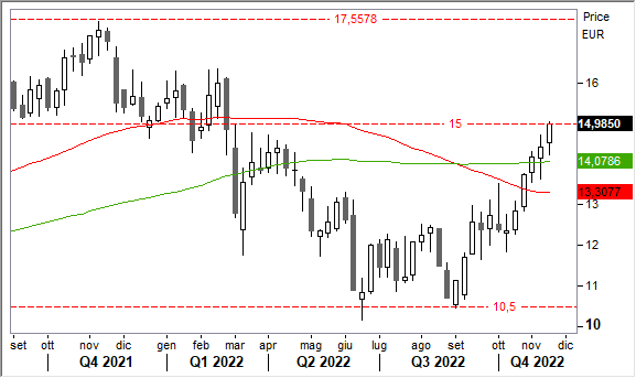 Operatività. Confermiamo la view positiva di lungo periodo, tuttavia lo strappo di questi giorni verso 14,60/15,00 euro ha consentito di prendere profitto sulla strategia di trading attivata a 13,10 euro. Nuovi livelli nella scheda tecnica.