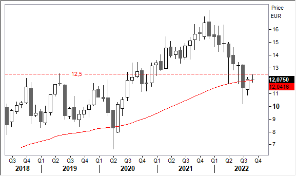 Graficamente, il quadro di fondo è ancora rialzista, mentre il quadro di breve è stato alterato bruscamente dallo scoppio della guerra in Ucraina e dal rialzo dei tassi. La reazione in corso è partita da un'area di forte sostegno, dove transita la media mobile di lungo periodo evidenziata in rosso. Segnali di spinta arriveranno con la risalita oltre 12,50 euro. Prime forti resistenze verso area 13,0/13,50 euro.