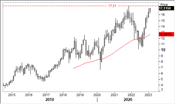 Graficamente, il trend è strutturalmente rialzista. La brillante reazione partita dai minimi di agosto 2022 in area 10,50 euro (in corrispondenza dei precedenti livelli di giugno) ha assunto maggiore consistenza con la violazione delle prime forti resistenze verso area 13,0/14,0 euro. Obbiettivo ormai in vista sui top assoluti in area 17,50 euro.