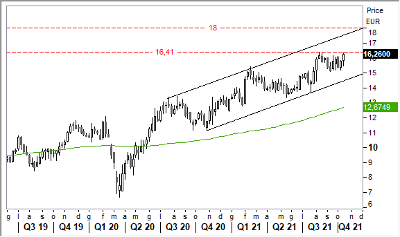 Graficamente, la tendenza di fondo rimane saldamente rialzista e spiegata bene dal canale crescente sotto evidenziato. L'uscita dalla banda 13,0-15,40 euro, che ha veicolato il movimento per circa sei mesi, ha fatto scattare nuove indicazioni di forza. Ulteriori spinte rialziste sono attese su piena rottura (che consideriamo altamente probabile) dei top assoluti in area 16,40 euro.