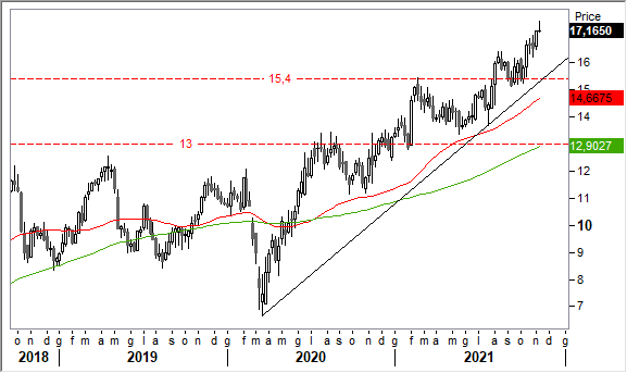 Graficamente, la tendenza di fondo rimane saldamente rialzista. L'uscita dalla banda 13,0-15,40 euro, che ha veicolato il movimento per circa sei mesi, ha fatto scattare nuove indicazioni di forza.