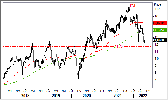 Graficamente, il quadro di breve è stato alterato bruscamente dal contemporaneo cedimento del sostegno di breve in area 14,28 euro, minimo di gennaio, e delle medie mobili evidenziate in rosso/verde. La discesa delle ultime sedute ha riportato la quotazione a ridosso dei minimi di marzo in area 11,75 euro, che rappresenta un forte sostegno di lungo periodo. Resistenze verso area 14,0 euro e verso area 15,0 euro, sulla seconda media mobile.