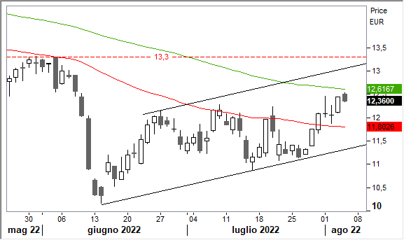 Graficamente, il quadro di fondo è ancora rialzista, mentre il quadro di breve è stato alterato bruscamente dallo scoppio della guerra in Ucraina e dal rialzo dei tassi. La reazione in corso è partita da un'area di forte sostegno, dove transita la media mobile di lungo periodo evidenziata in rosso. Segnali di spinta arriveranno con la risalita oltre 12,50 euro. Prime forti resistenze verso area 13,0/13,50 euro.