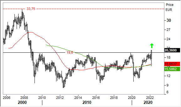 La violazione della forte area di resistenza nel range 19,0/19,60 euro, top di valenza pluriennale, rappresenta una inversione del trend in grado di proiettare obiettivi finali molto importanti, anche fino ad area 33 euro, massimi pre-Lehman Brothers.