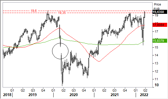 Graficamente, dai minimi del 2020 la tendenza ha imboccato con convizione la strada del rialzo. Un primo segnale di riequilibrio è giunto con la chiusura del gap-down aperto nel range 14-15 euro in occasione dello scoppio della pandemia. Rinnovati segnali di spinta sono arrivati con la piena rottura di area 18 euro. Forte area di resistenza nel range 19,0/19,60 euro, top del 2019.